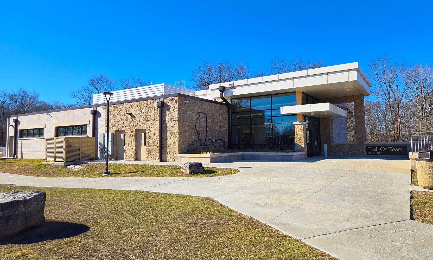 The project consisted of the demolition and construction of two different rest area buildings at the Trail of Tears Northbound site and Trail of Tears Southbound site. The design of the building and the exterior landscaping reflect the significance of the site locations and proximity to the Trail of Tears. Each building is approximately 6000 sq. ft., and consist of two gang restrooms, a security office, vending storage, breakroom area, building services storage and