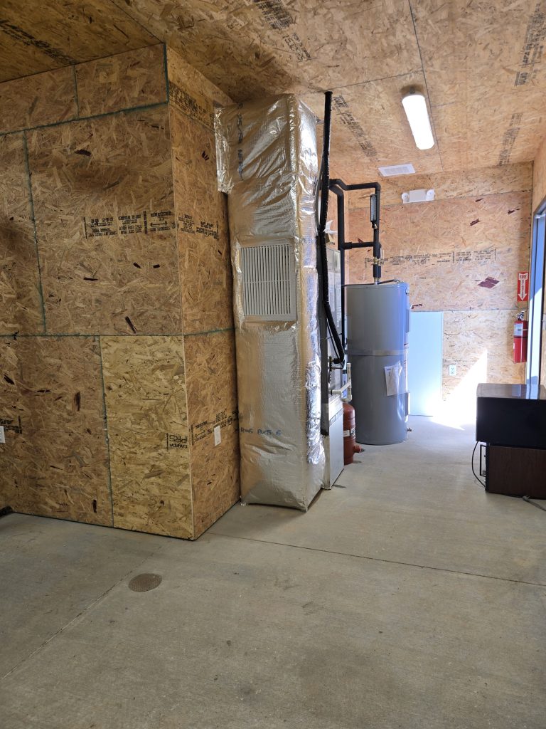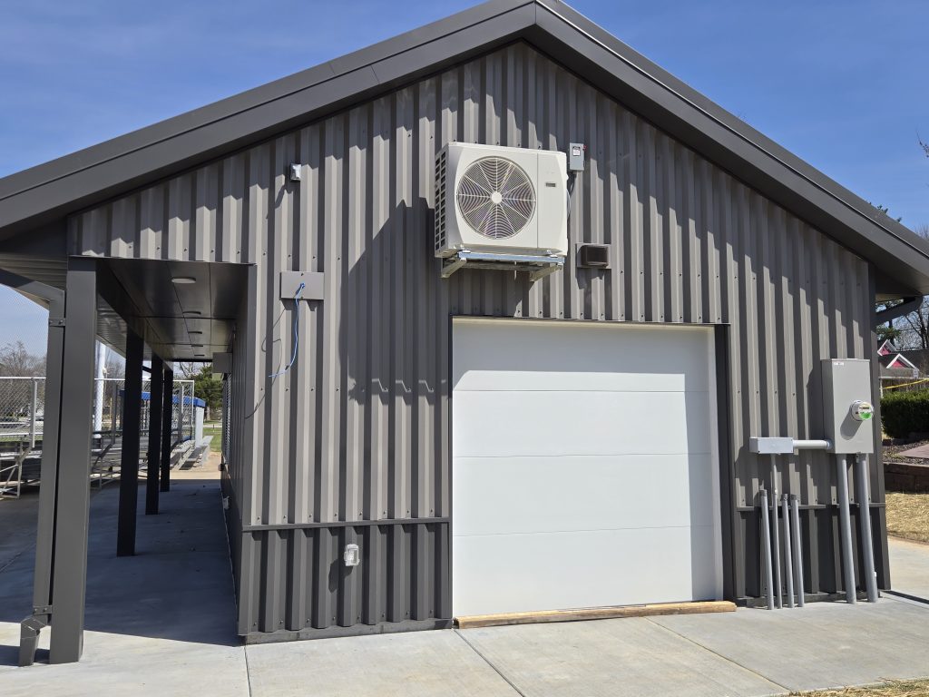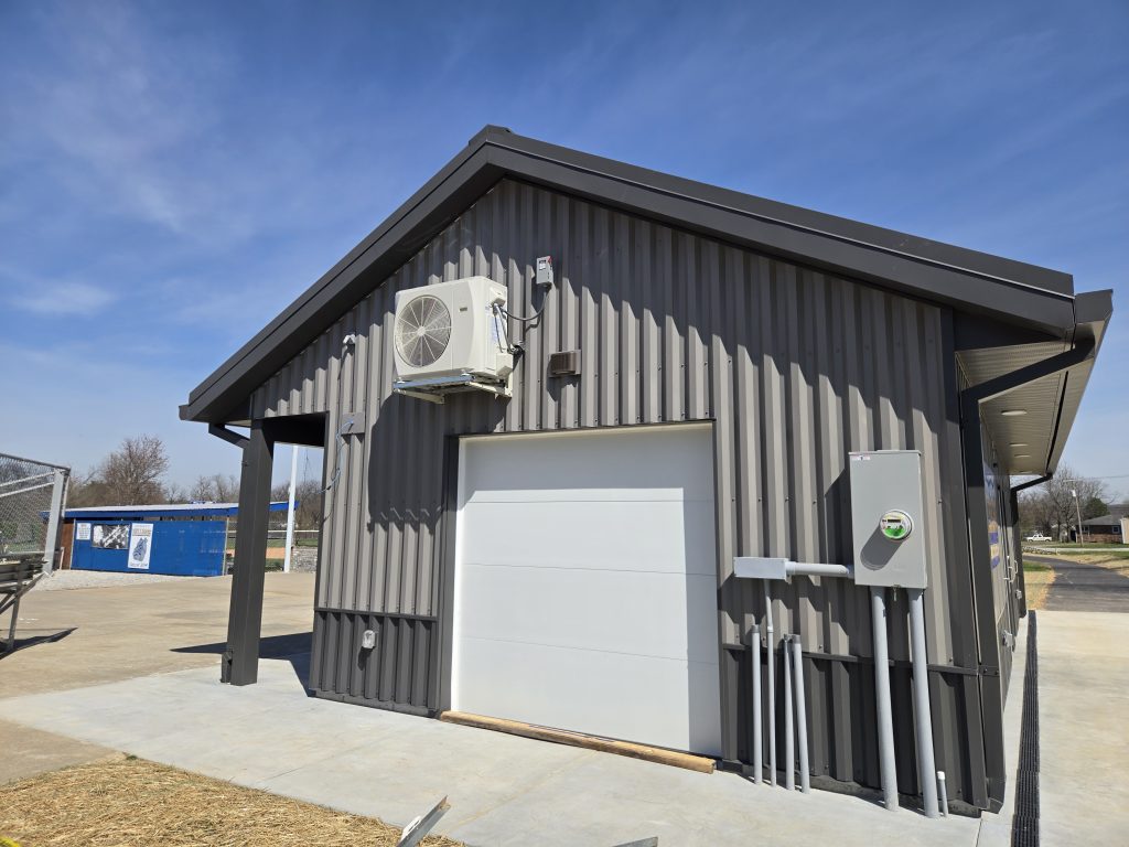 The new building features wood-framed construction on a concrete slab foundation, durable metal panel exterior cladding, and an asphalt shingle roofing system. Comprehensive MEP improvements were incorporated, including HVAC systems for building conditioning, new plumbing installations, and upgraded electrical service.